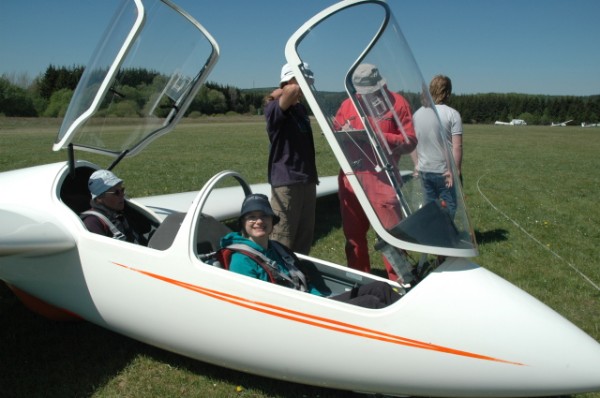 Leonie hat schon für einen Schnupperflug in unserer ASK 21 Platz genommen. Auf dem Rücken trägt sie den obligatorischen Fallschirm und durch die Anschallgurte ist sie sicher mit dem Segelflugzeug verbunden. Hinter ihr wartet schon unsere Cheffluglehrerin Renate darauf, Leonie die Schönheit des Segelflugs näher zu bringen.